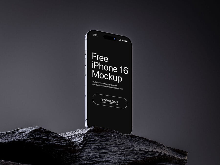 Showcase your mobile apps, websites, or branding projects with this free iPhone 16 Mockup on a rocky surface with sleek lighting. Featuring the sleek iPhone 16 placed on a rugged, dramatic stone texture with professional lighting, this mockup adds a bold, high-tech edge to your design presentations.